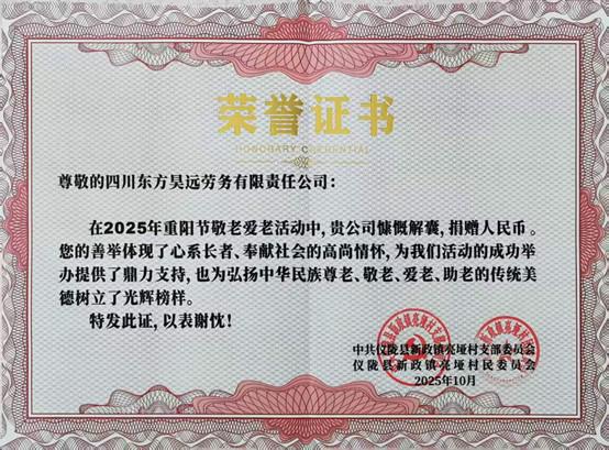 近日,昊远公司收到中共仪陇县新政镇亮垭村支部委员会、仪陇县新政镇亮垭村民委员会联合颁发的荣誉证书,以表彰我司在2025年重阳...